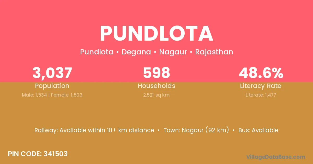 Nagaur (92 km) is the nearest town to Pundlota village for major economic activities and is located approximately 92 km away.