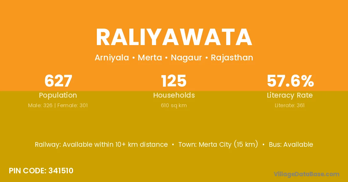 Merta City (50 km) is the nearest town to Raliyawata village for major economic activities and is located approximately 50 km away.