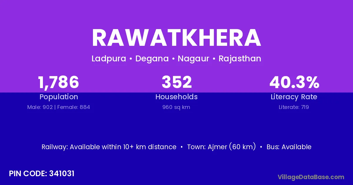 Ajmer (60 km) is the nearest town to Rawatkhera village for major economic activities and is located approximately 60 km away.
