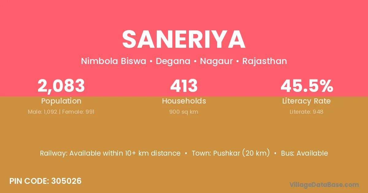 Pushkar (20 km) is the nearest town to Saneriya village for major economic activities and is located approximately 20 km away.