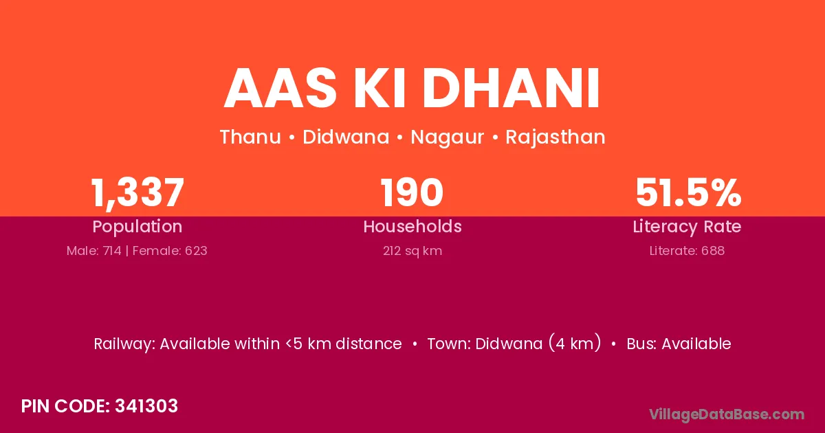 Aas Ki Dhani village has a total population of 1,337 people, of which 714 are males and 623 are females.