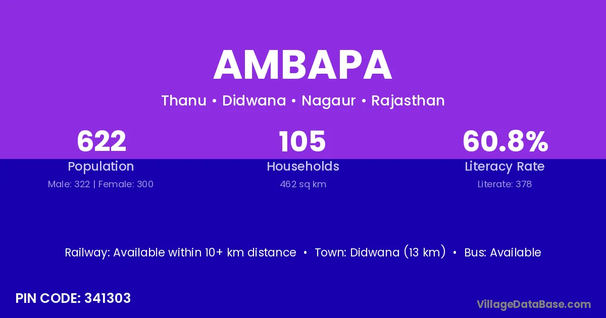 Didwana (13 km) is the nearest town to Ambapa village for major economic activities and is located approximately 13 km away.
