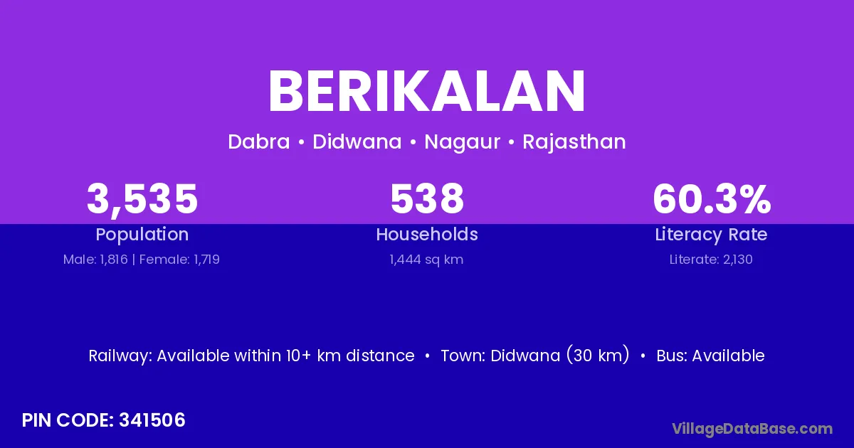 Didwana (30 km) is the nearest town to Berikalan village for major economic activities and is located approximately 30 km away.