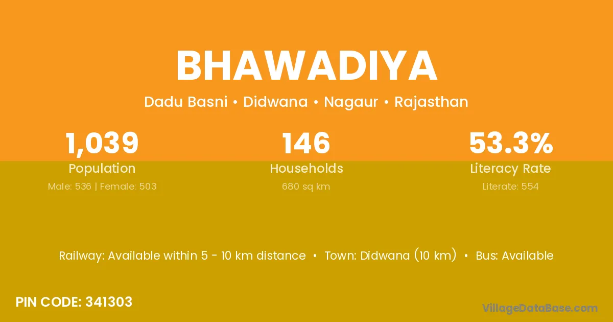 Didwana (10 km) is the nearest town to Bhawadiya village for major economic activities and is located approximately 10 km away.