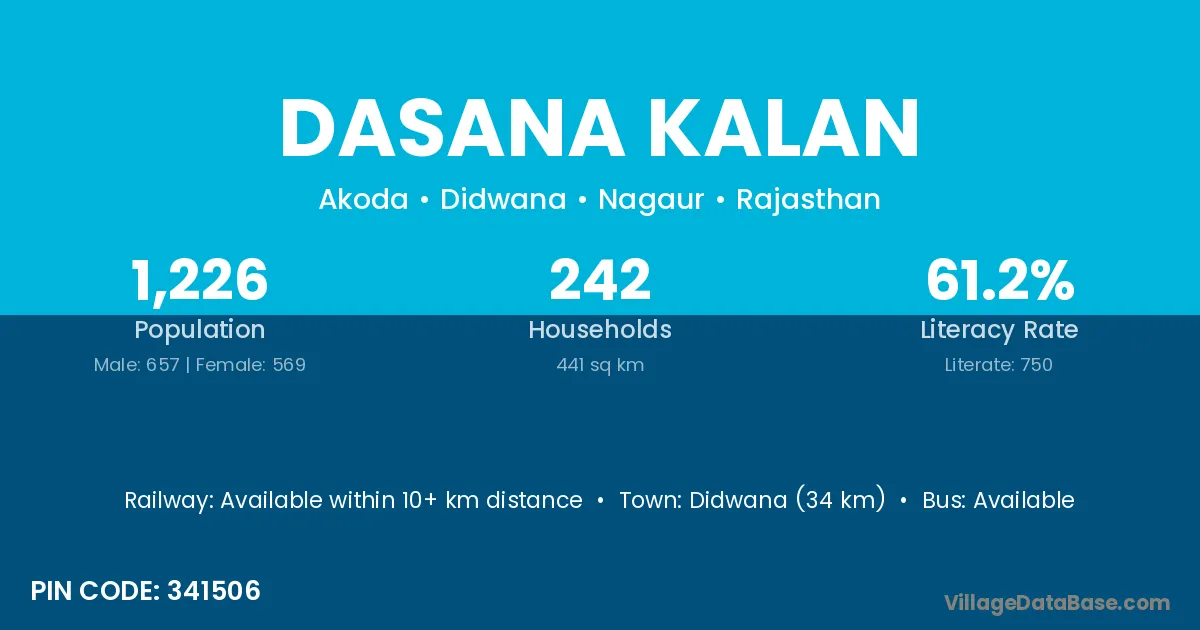 Didwana (34 km) is the nearest town to Dasana Kalan village for major economic activities and is located approximately 34 km away.