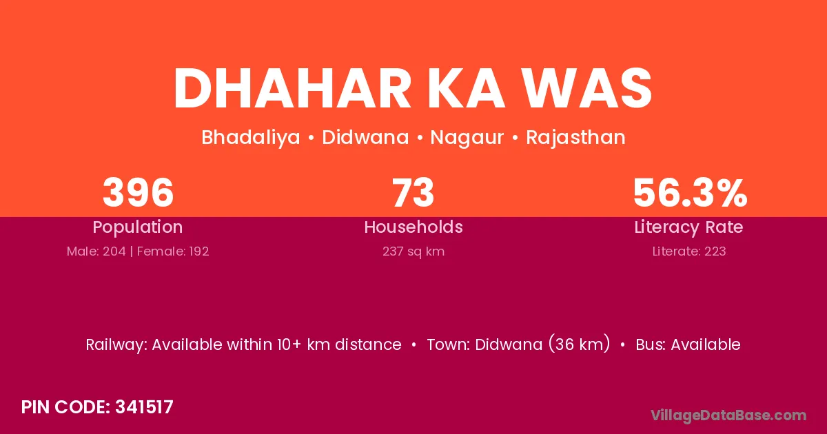 Didwana (36 km) is the nearest town to Dhahar Ka Was village for major economic activities and is located approximately 36 km away.