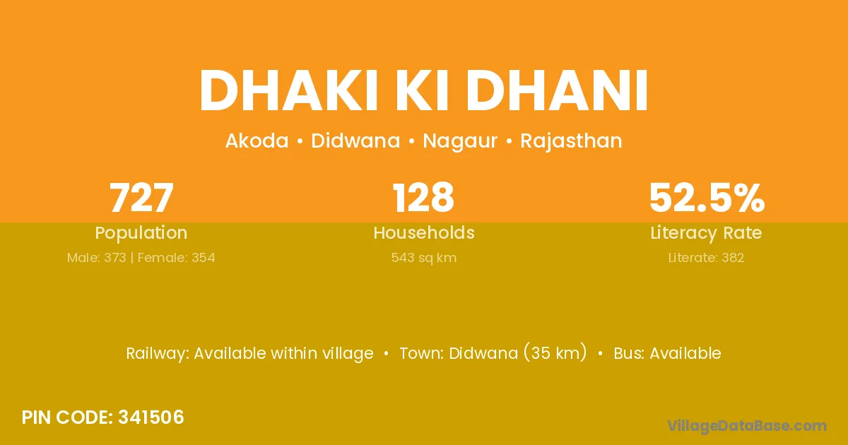 Didwana (35 km) is the nearest town to Dhaki Ki Dhani village for major economic activities and is located approximately 35 km away.