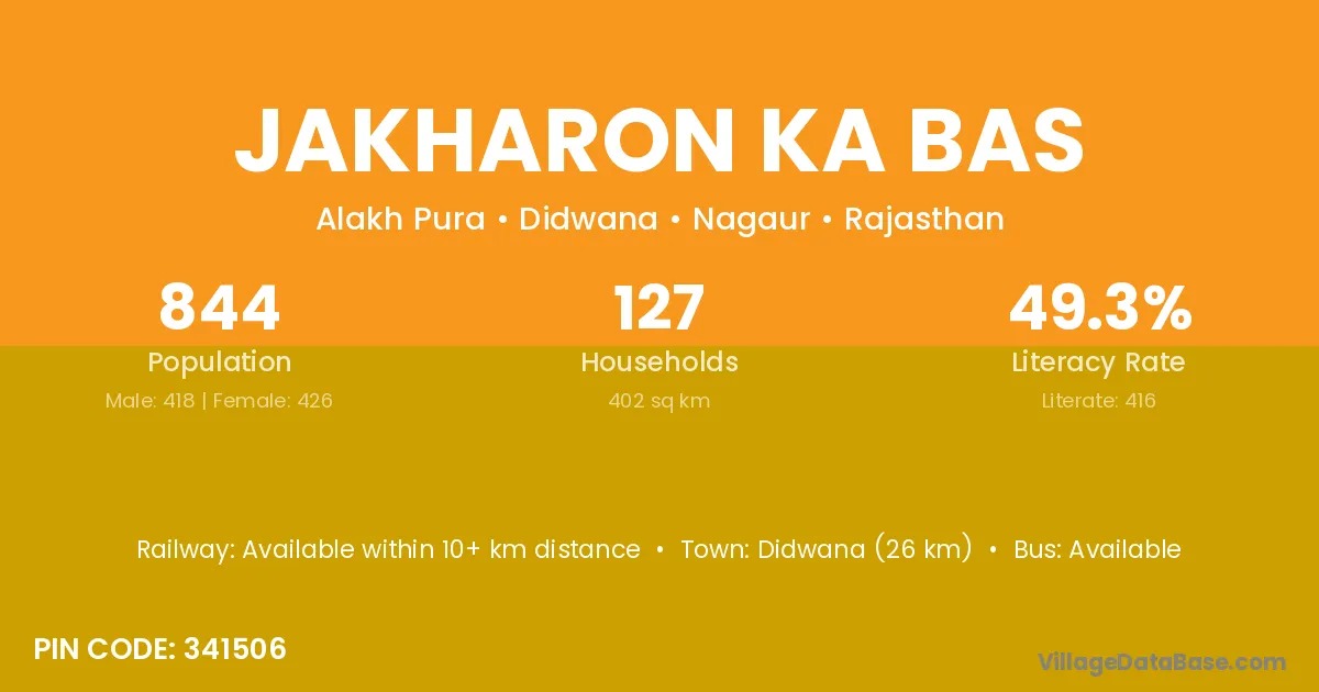 Jakharon Ka Bas village has a total population of 844 people, of which 418 are males and 426 are females.