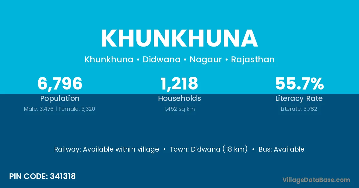 Didwana (18 km) is the nearest town to Khunkhuna village for major economic activities and is located approximately 18 km away.