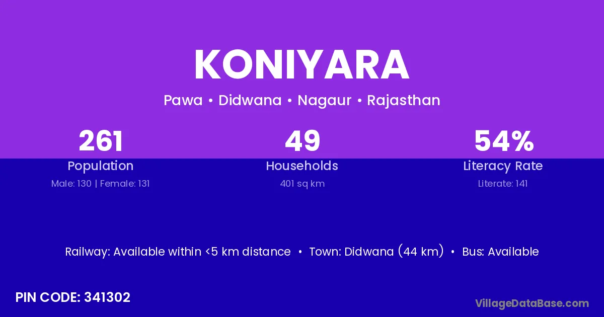 Didwana (44 km) is the nearest town to Koniyara village for major economic activities and is located approximately 44 km away.
