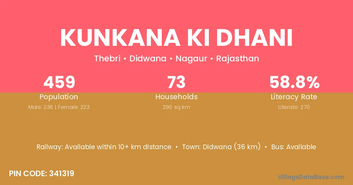 Kunkana Ki Dhani village has a total population of 459 people, of which 236 are males and 223 are females.