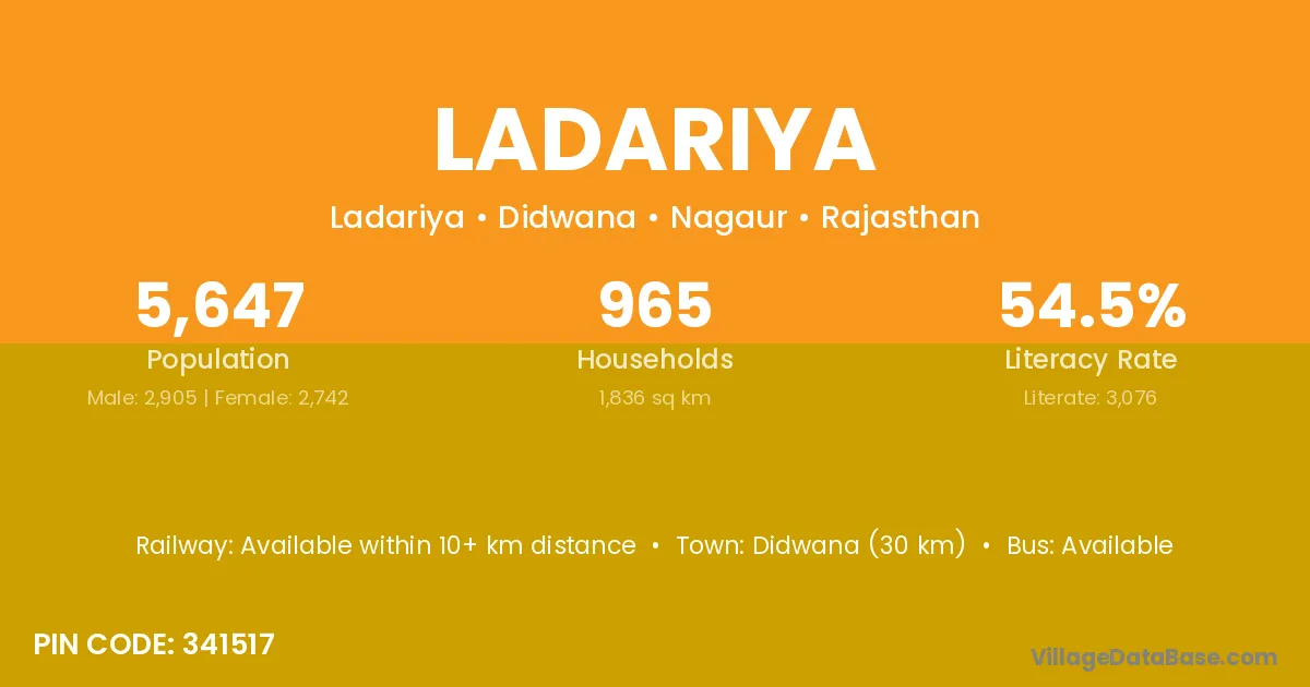 Didwana (30 km) is the nearest town to Ladariya village for major economic activities and is located approximately 30 km away.