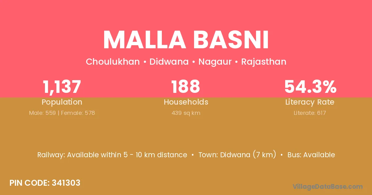 Didwana (7 km) is the nearest town to Malla Basni village for major economic activities and is located approximately 7 km away.