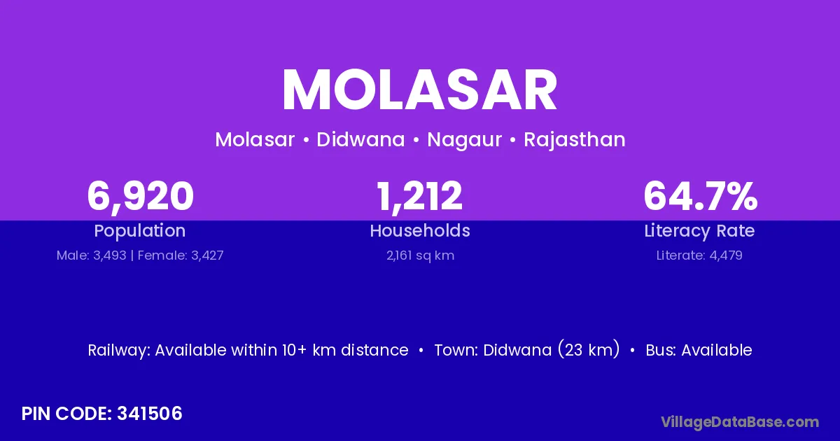 Didwana (23 km) is the nearest town to Molasar village for major economic activities and is located approximately 23 km away.