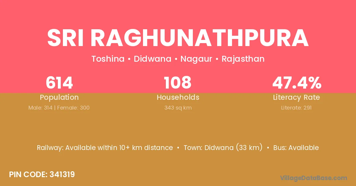 Didwana (33 km) is the nearest town to Sri Raghunathpura village for major economic activities and is located approximately 33 km away.