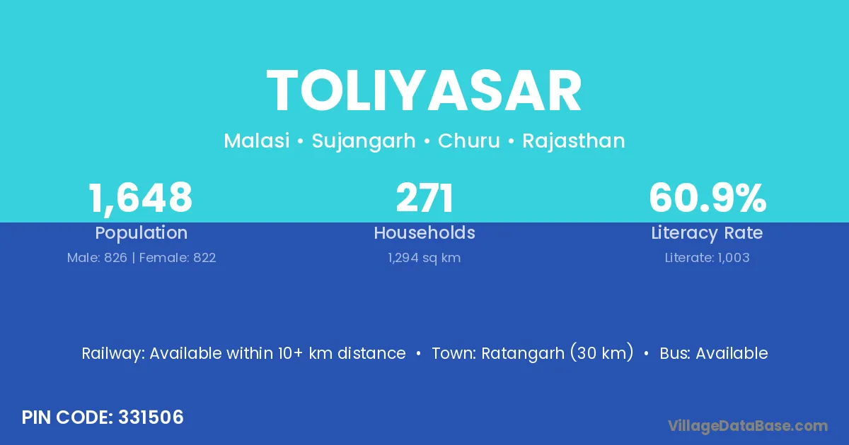 Didwana (30 km) is the nearest town to Toliyasar village for major economic activities and is located approximately 30 km away.
