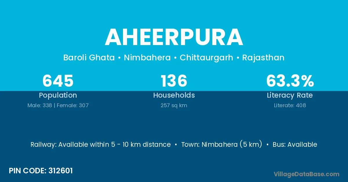 Nagaur (58 km) is the nearest town to Aheerpura village for major economic activities and is located approximately 58 km away.