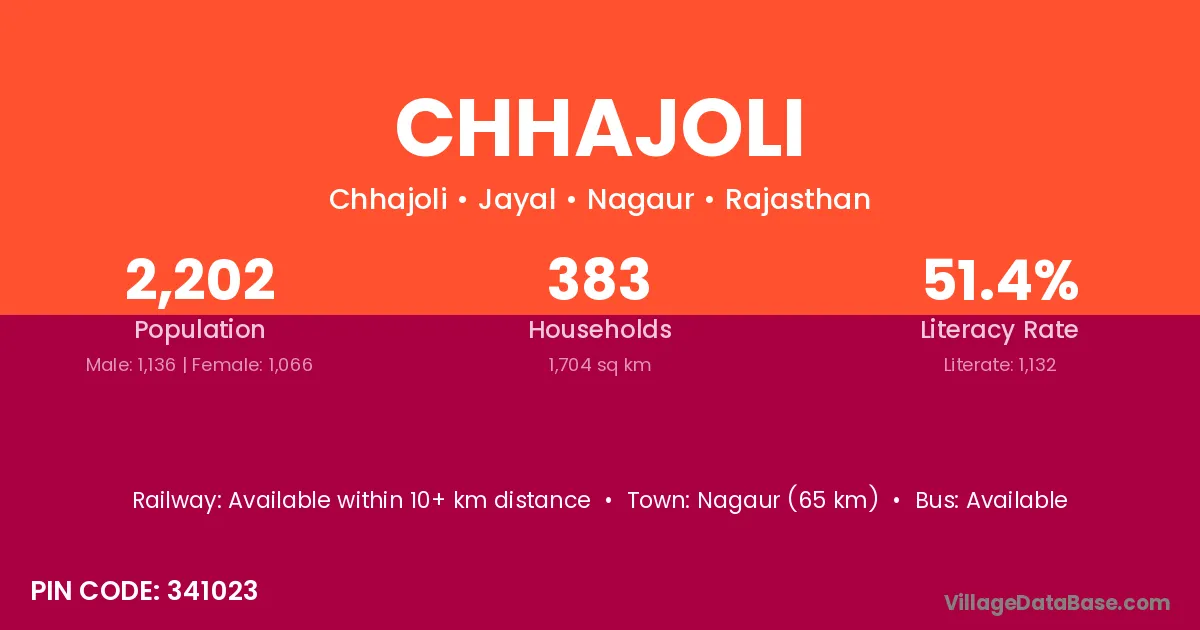 Nagaur (65 km) is the nearest town to Chhajoli village for major economic activities and is located approximately 65 km away.