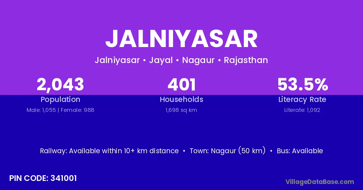Nagaur (50 km) is the nearest town to Jalniyasar village for major economic activities and is located approximately 50 km away.