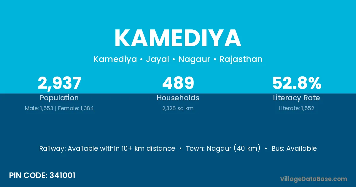 Nagaur (40 km) is the nearest town to Kamediya village for major economic activities and is located approximately 40 km away.