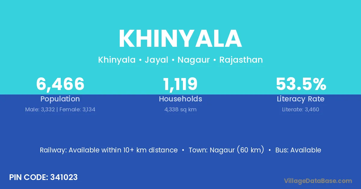 Nagaur (60 km) is the nearest town to Khinyala village for major economic activities and is located approximately 60 km away.