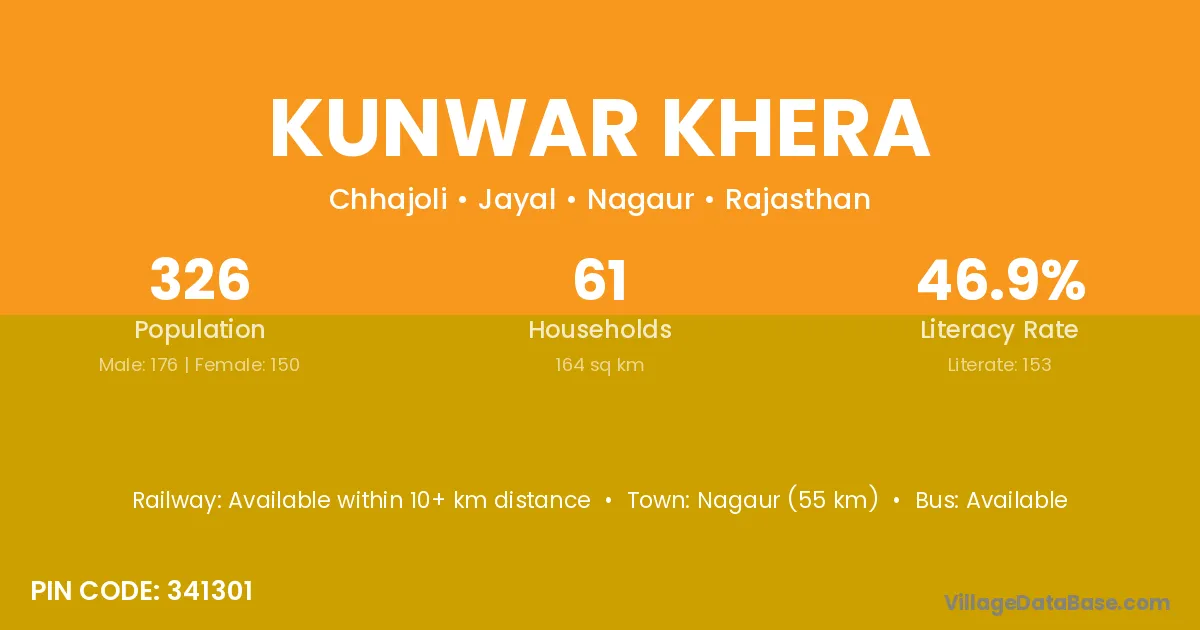 Nagaur (55 km) is the nearest town to Kunwar Khera village for major economic activities and is located approximately 55 km away.