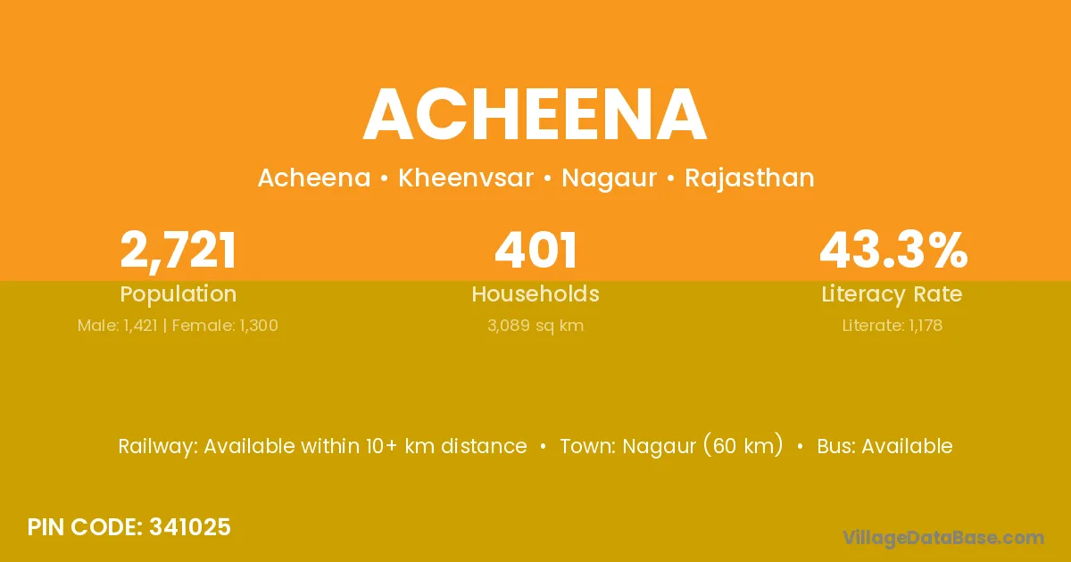 Nagaur (60 km) is the nearest town to Acheena village for major economic activities and is located approximately 60 km away.