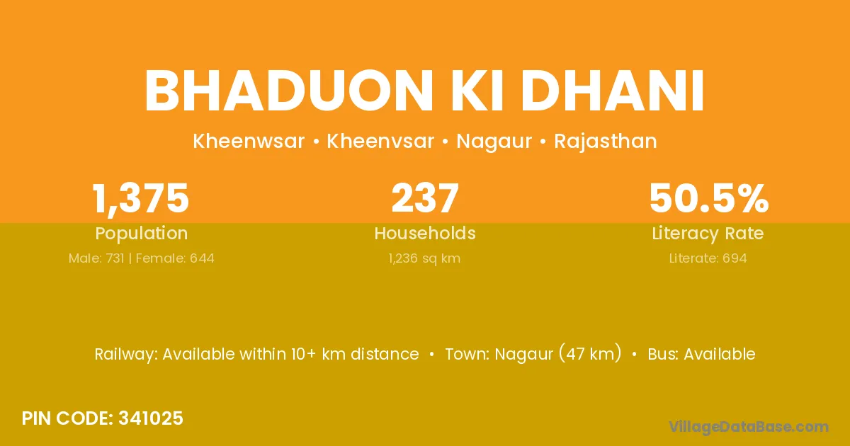 Nagaur (47 km) is the nearest town to Bhaduon Ki Dhani village for major economic activities and is located approximately 47 km away.