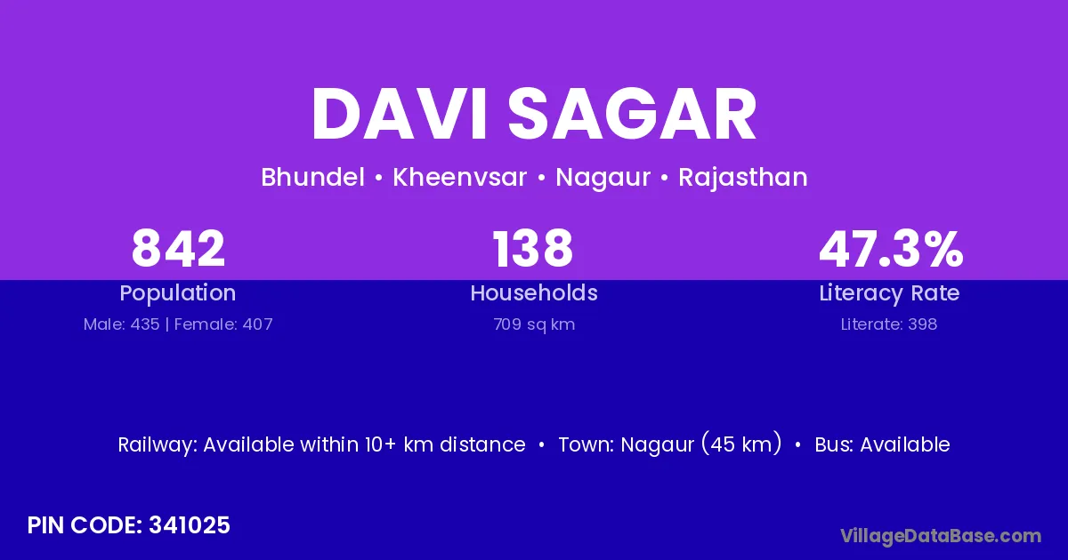 Nagaur (45 km) is the nearest town to Davi Sagar village for major economic activities and is located approximately 45 km away.