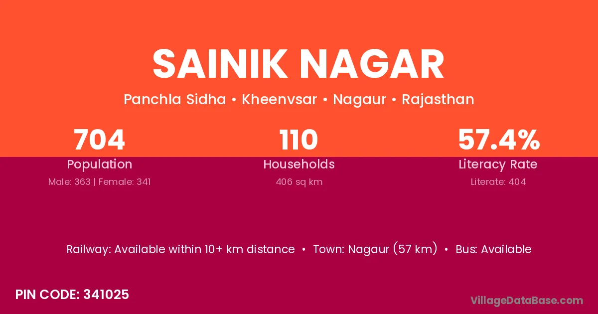 Nagaur (57 km) is the nearest town to Sainik Nagar village for major economic activities and is located approximately 57 km away.