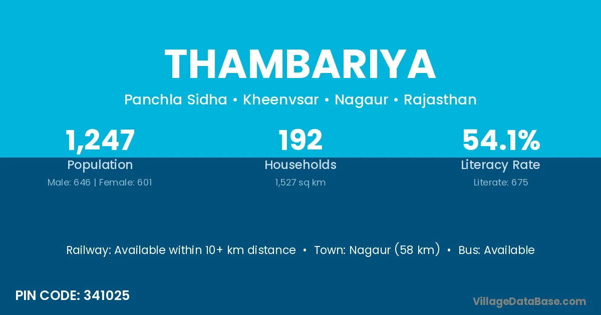 Nagaur (58 km) is the nearest town to Thambariya village for major economic activities and is located approximately 58 km away.