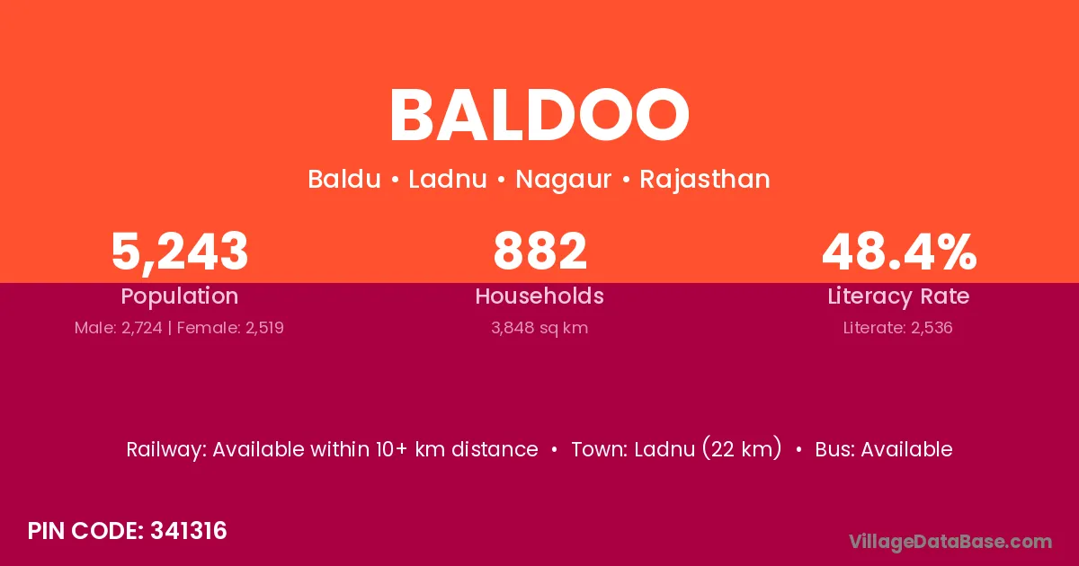 Ladnu (22 km) is the nearest town to Baldoo village for major economic activities and is located approximately 22 km away.