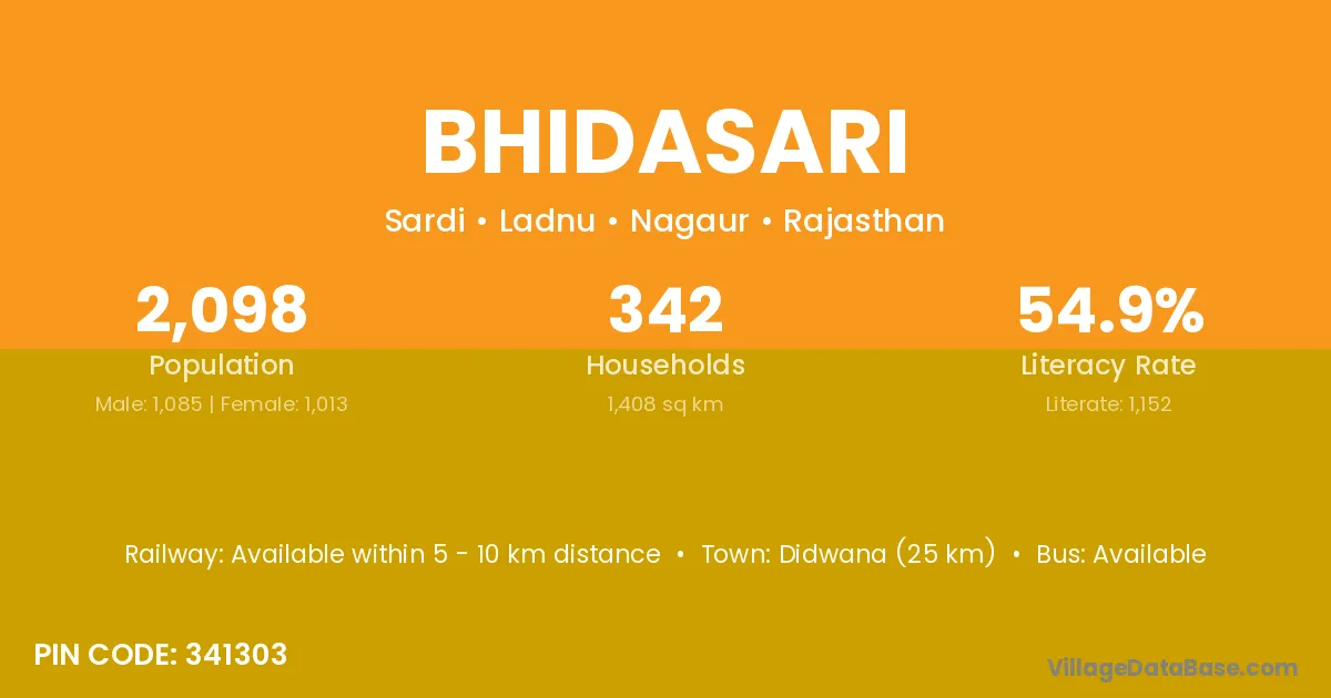 Didwana (25 km) is the nearest town to Bhidasari village for major economic activities and is located approximately 25 km away.