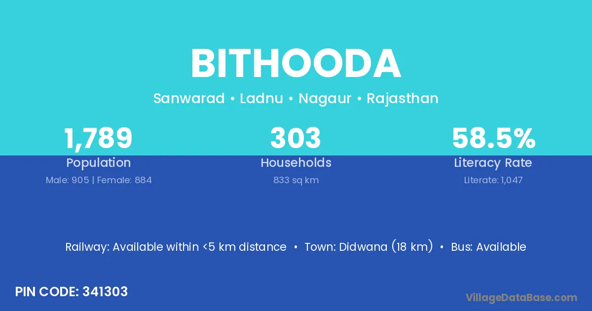 Didwana (18 km) is the nearest town to Bithooda village for major economic activities and is located approximately 18 km away.