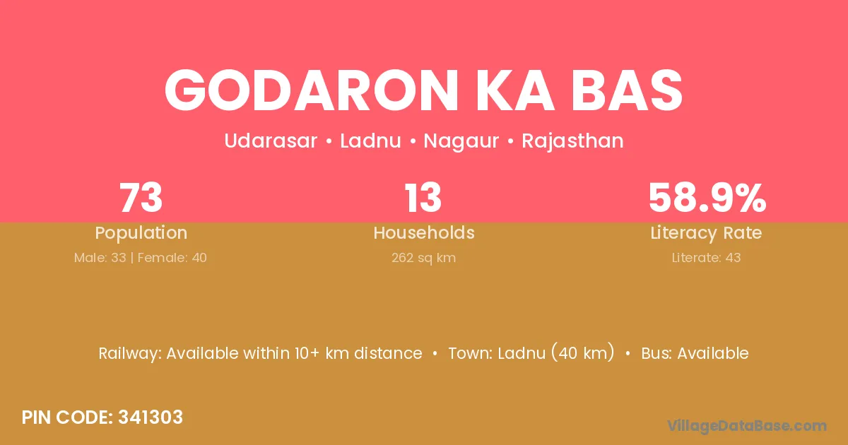 Godaron Ka Bas village has a total population of 73 people, of which 33 are males and 40 are females.