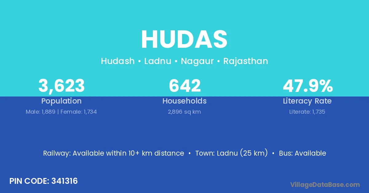 Ladnu (25 km) is the nearest town to Hudas village for major economic activities and is located approximately 25 km away.