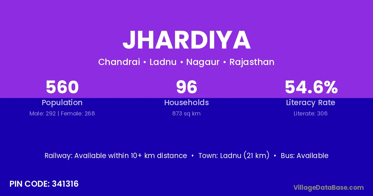 Ladnu (21 km) is the nearest town to Jhardiya village for major economic activities and is located approximately 21 km away.