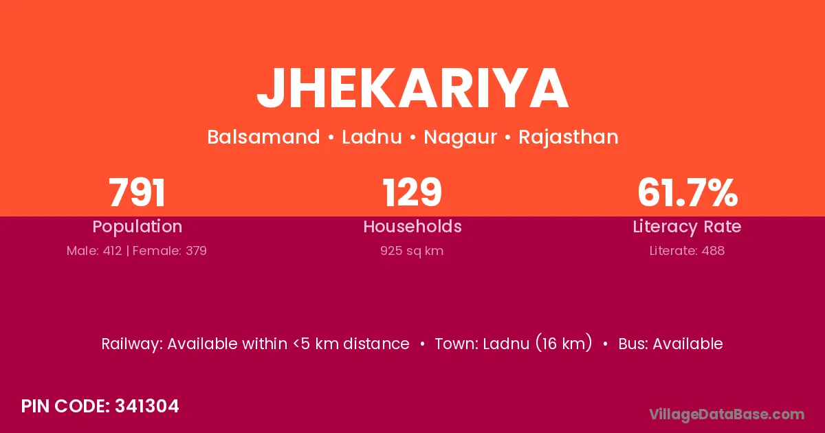Ladnu (16 km) is the nearest town to Jhekariya village for major economic activities and is located approximately 16 km away.