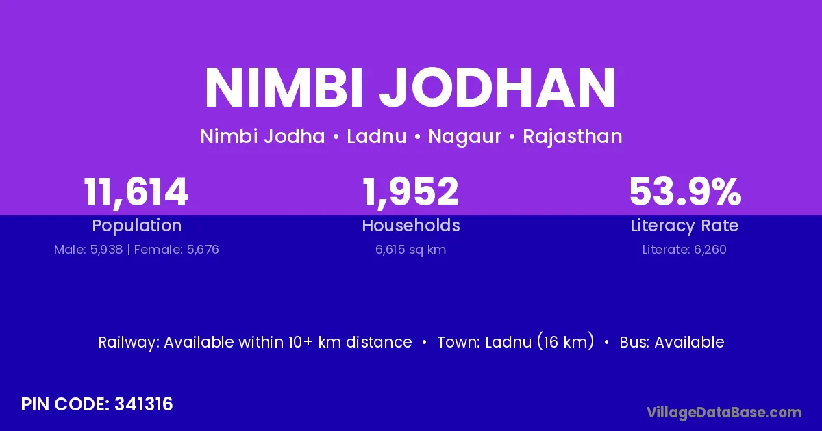 Ladnu (16 km) is the nearest town to Nimbi Jodhan village for major economic activities and is located approximately 16 km away.