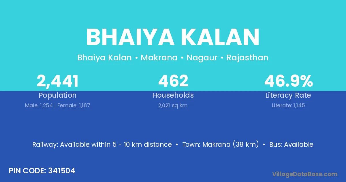 Makrana (38 km) is the nearest town to Bhaiya Kalan village for major economic activities and is located approximately 38 km away.