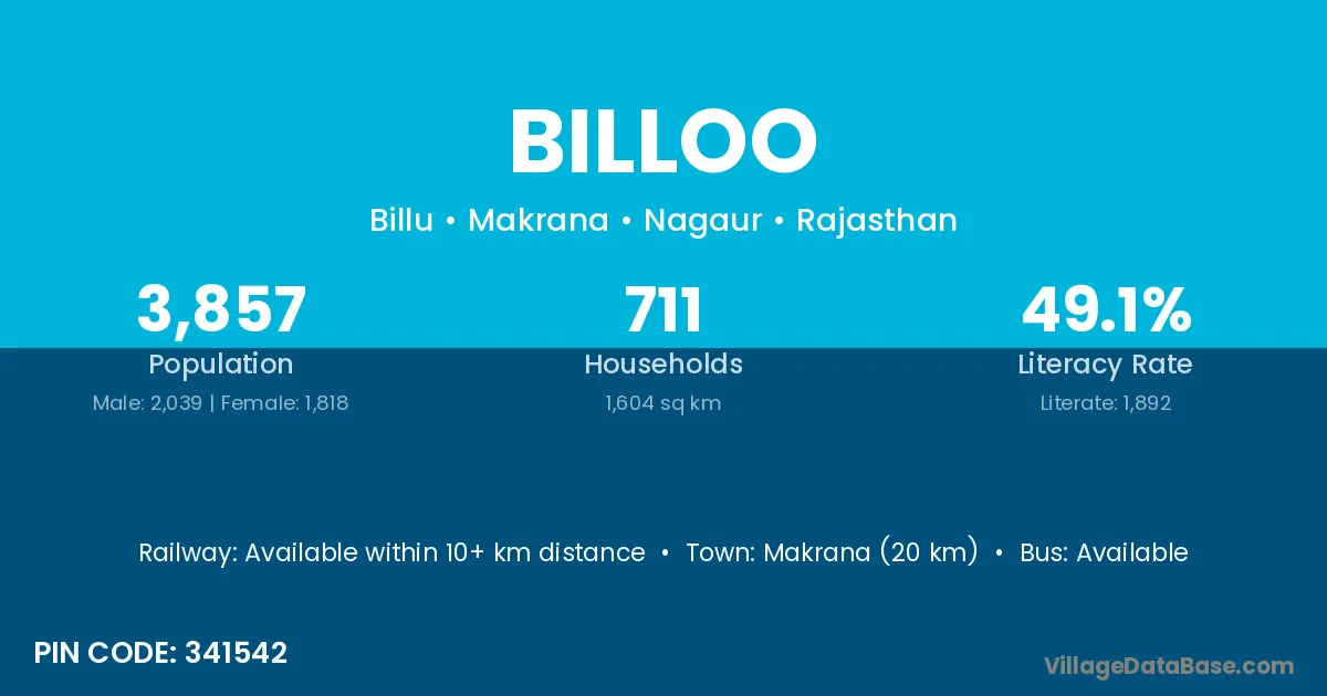 Makrana (20 km) is the nearest town to Billoo village for major economic activities and is located approximately 20 km away.