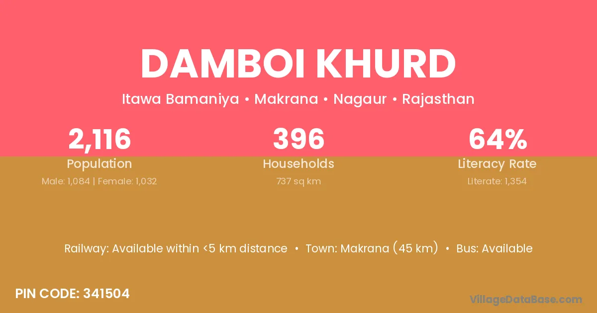 Makrana (45 km) is the nearest town to Damboi Khurd village for major economic activities and is located approximately 45 km away.