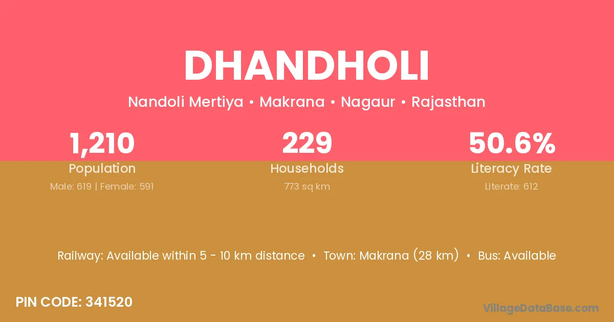 Makrana (28 km) is the nearest town to Dhandholi village for major economic activities and is located approximately 28 km away.