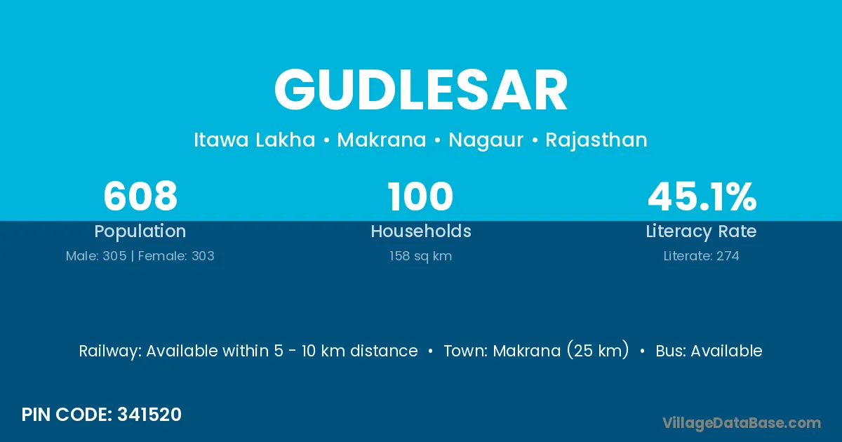 Makrana (25 km) is the nearest town to Gudlesar village for major economic activities and is located approximately 25 km away.