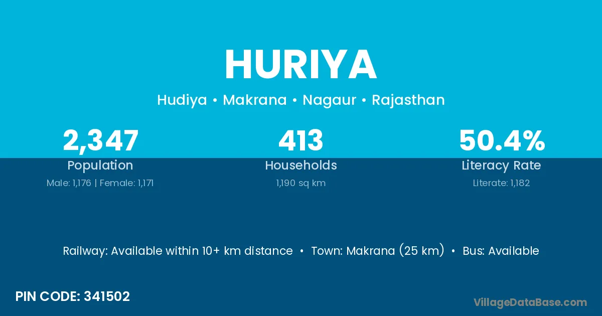 Makrana (25 km) is the nearest town to Huriya village for major economic activities and is located approximately 25 km away.