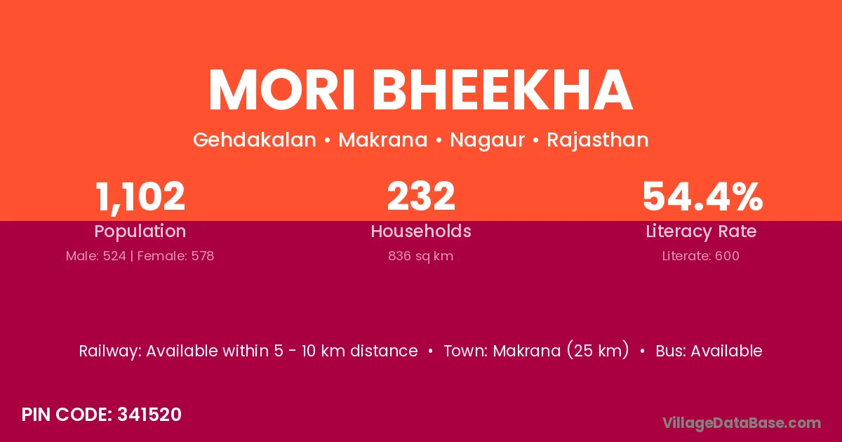 Makrana (25 km) is the nearest town to Mori Bheekha village for major economic activities and is located approximately 25 km away.