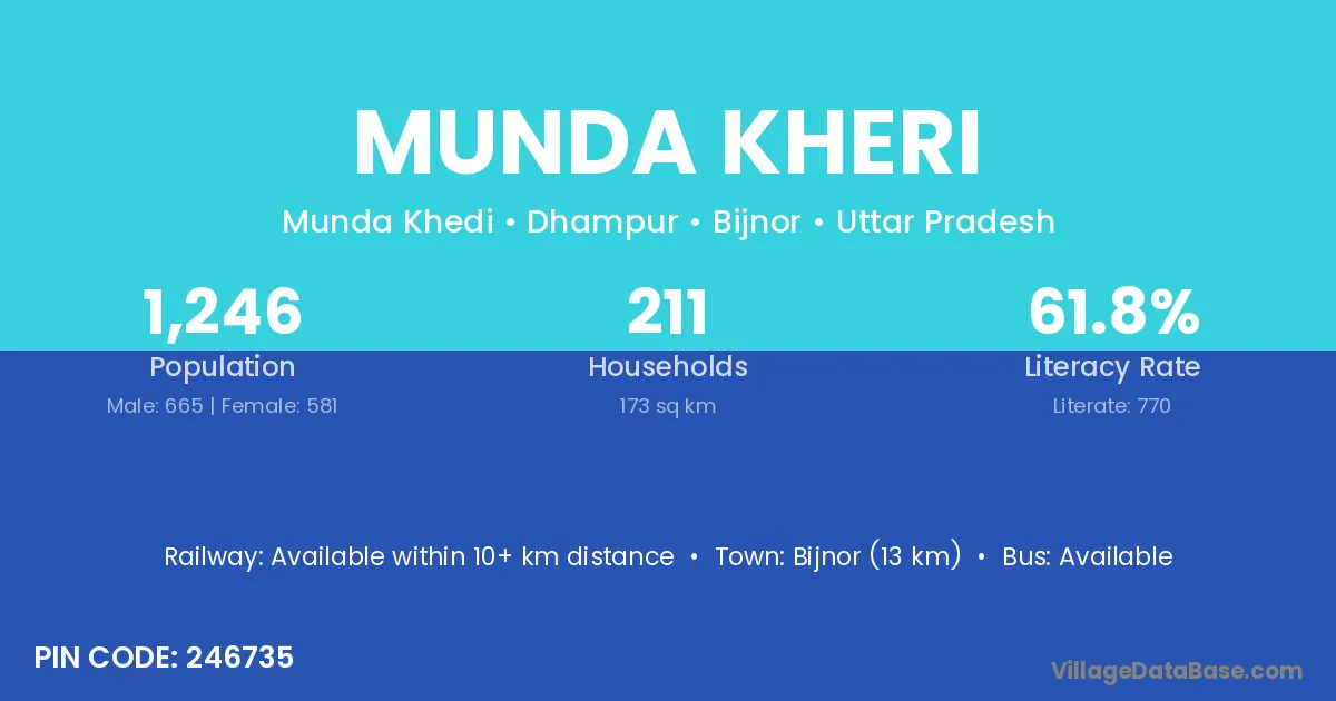 Makrana (40 km) is the nearest town to Munda Kheri village for major economic activities and is located approximately 40 km away.