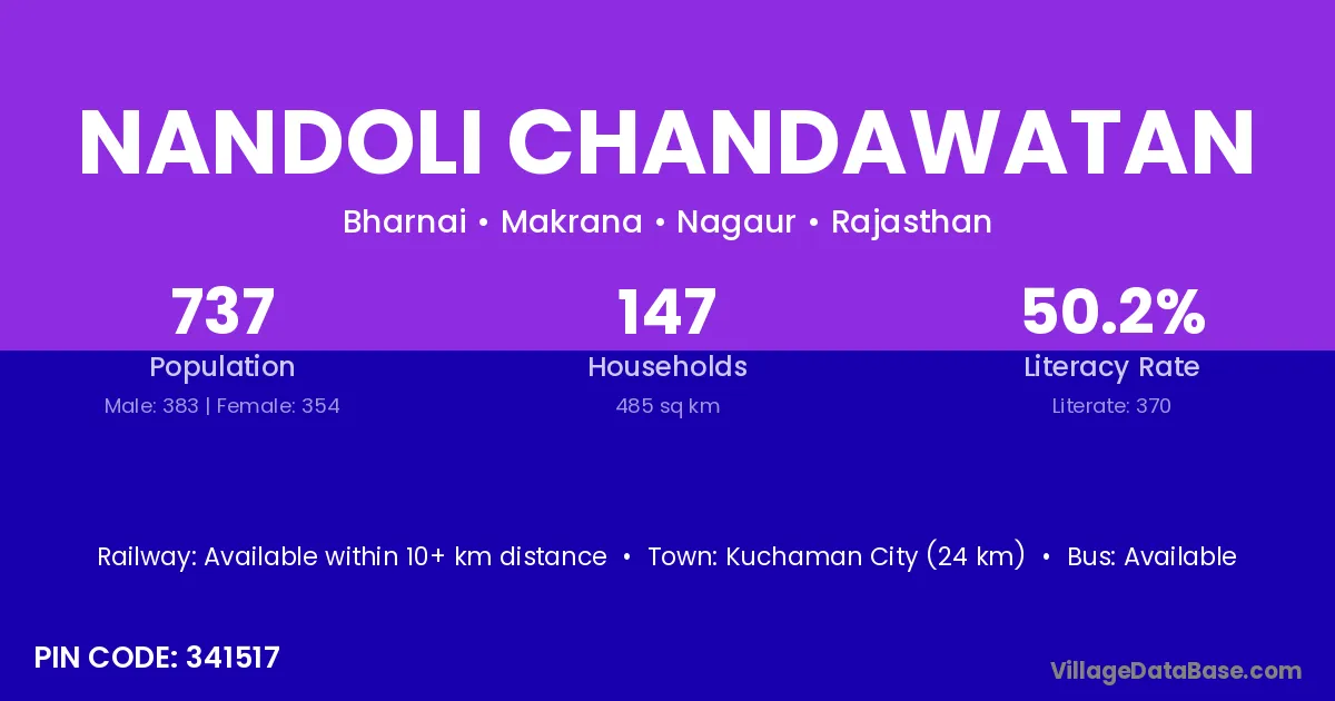 Kuchaman City (24 km) is the nearest town to Nandoli Chandawatan village for major economic activities and is located approximately 24 km away.