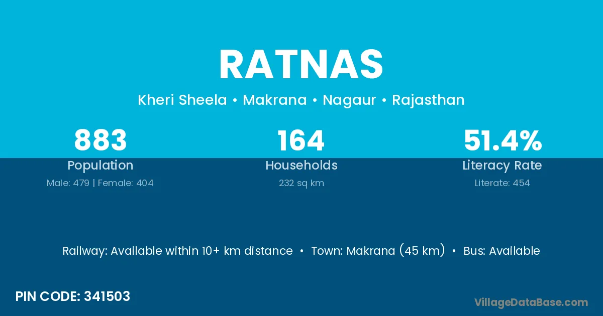 Makrana (45 km) is the nearest town to Ratnas village for major economic activities and is located approximately 45 km away.