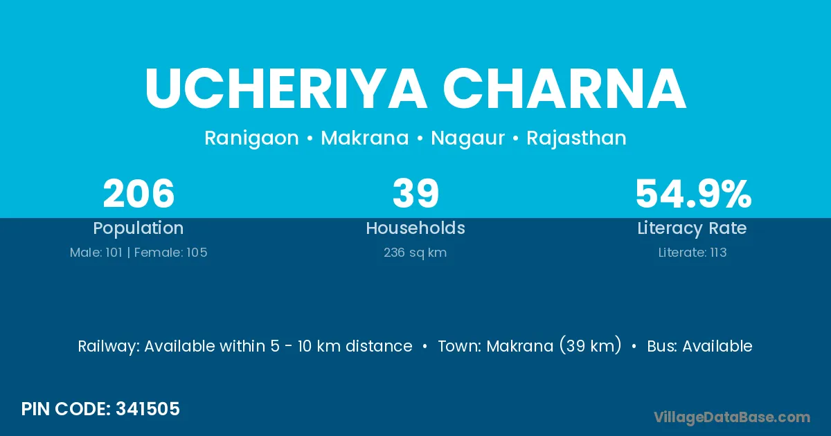 Makrana (39 km) is the nearest town to Ucheriya Charna village for major economic activities and is located approximately 39 km away.